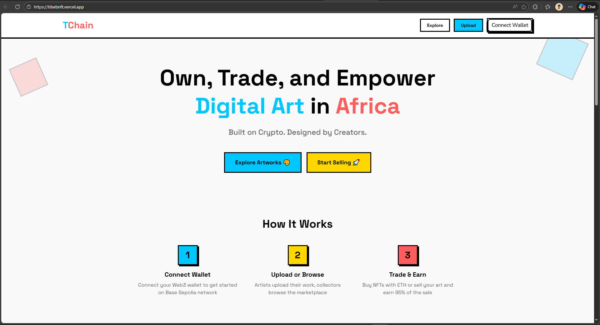 TibebChain is a Web3 platform built on Base that allows creators to upload articles and digital art and showcase them in an NFT gallery, where users can buy artworks using cryptocurrency. The project focuses on decentralized publishing, creator ownership, and transparent crypto-based transactions..